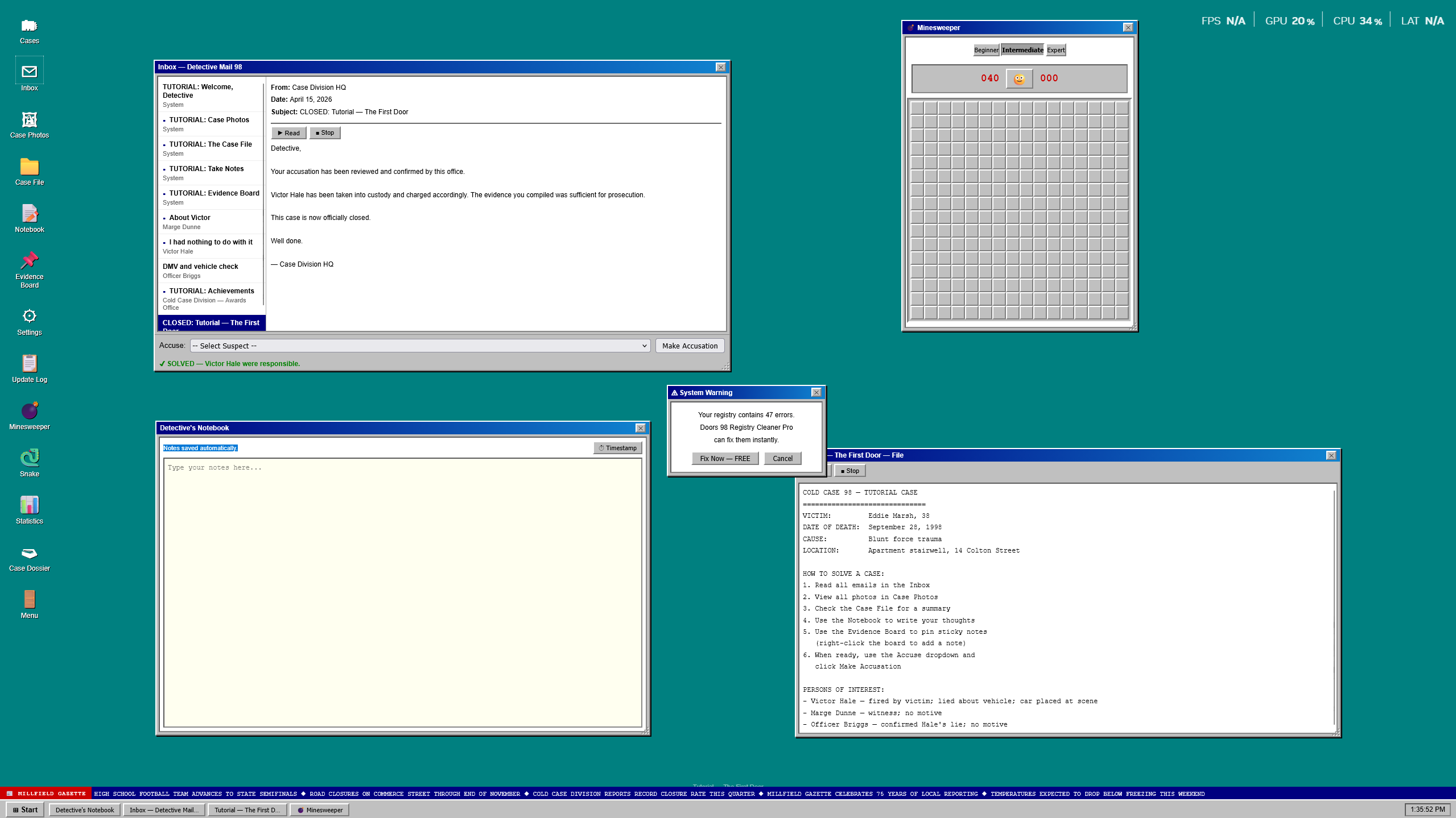 Doors 98 is a browser-based detective mystery game set inside a fictional Windows 98 desktop environment.